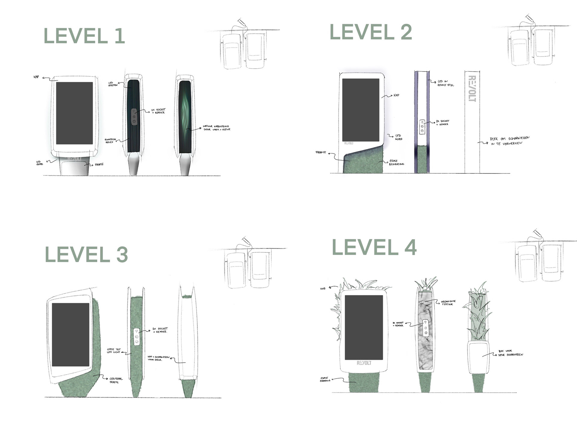 In the summer of 2020, together with a dreamteam consisting of Kevin Schouwenaar, Fay de Grefte & Pim van Os, we acquired a freelance project for Revolt (a Pon Holding subsidiary) working in the field of EV charging. Revolt asked us to design the exterior & interior configuration for their new charging station. Over a period of roughly 4 weeks, we developed a design ready for prototype manufacturing; from first sketch to technical drawing. Throughout this pressure cooker project, we worked closely together with PIA automation & Pon Power. Currently, Revolt is running a pilot with three 1 : 1 prototypes in the Amsterdam Area.