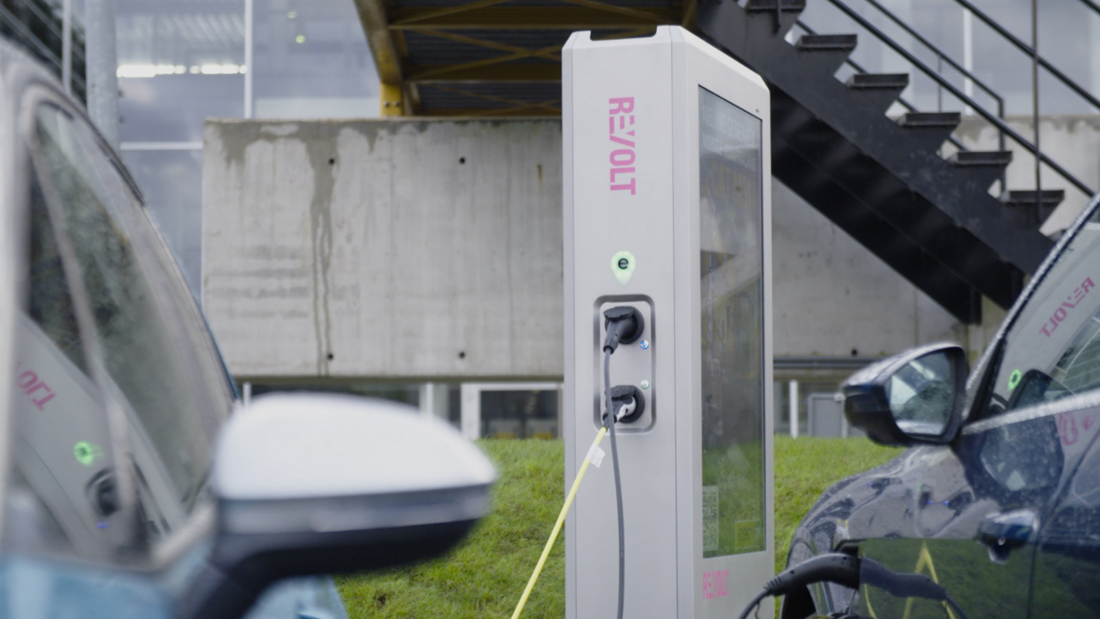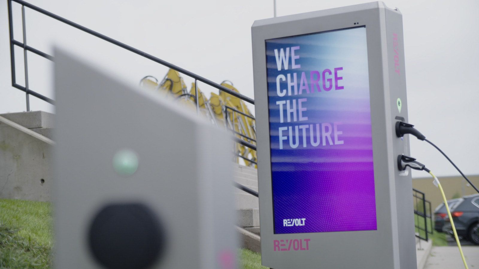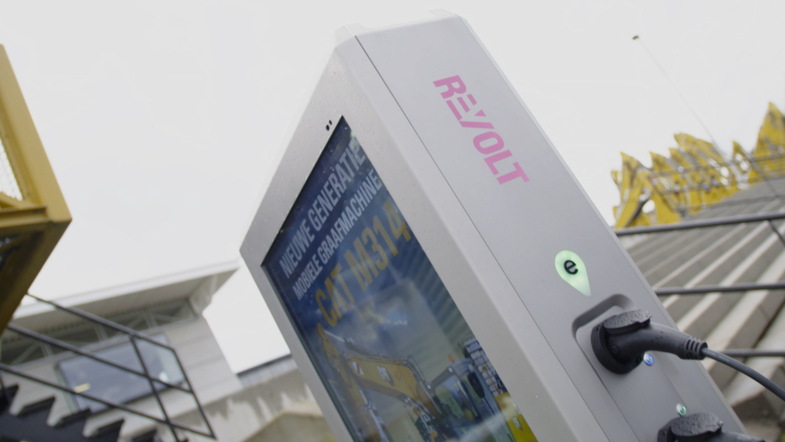 The charging station has a double function, as it's used for charging and advertising at the same time. On both sides, a 55" screen is used not only for commercials but also for creating a more involved charging experience. The design is in line with Revolt's values; bold,